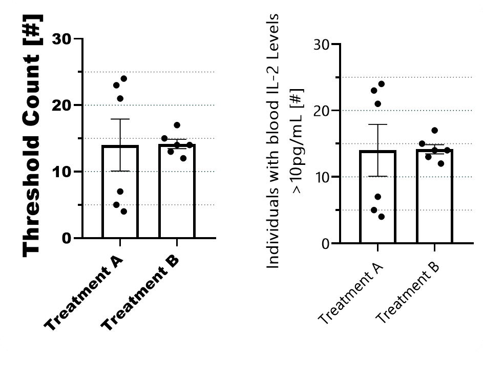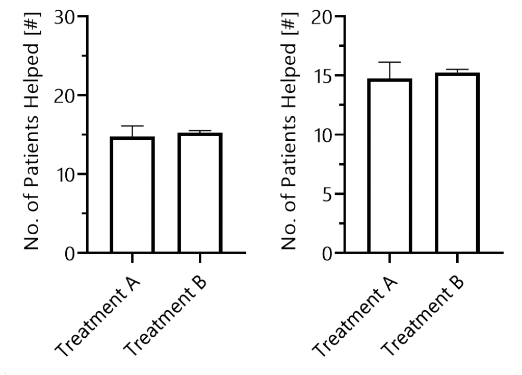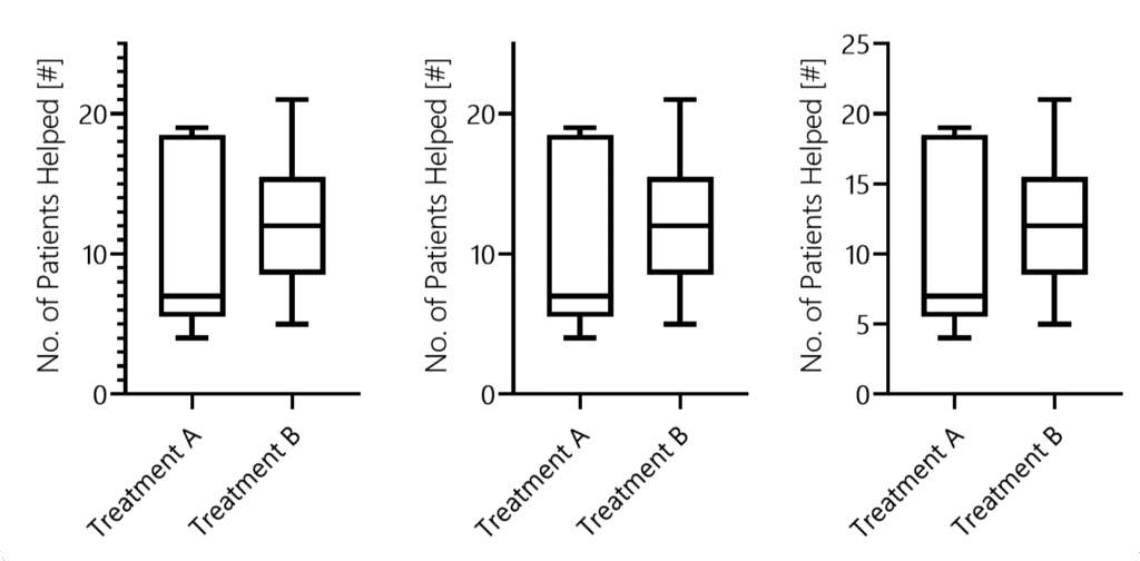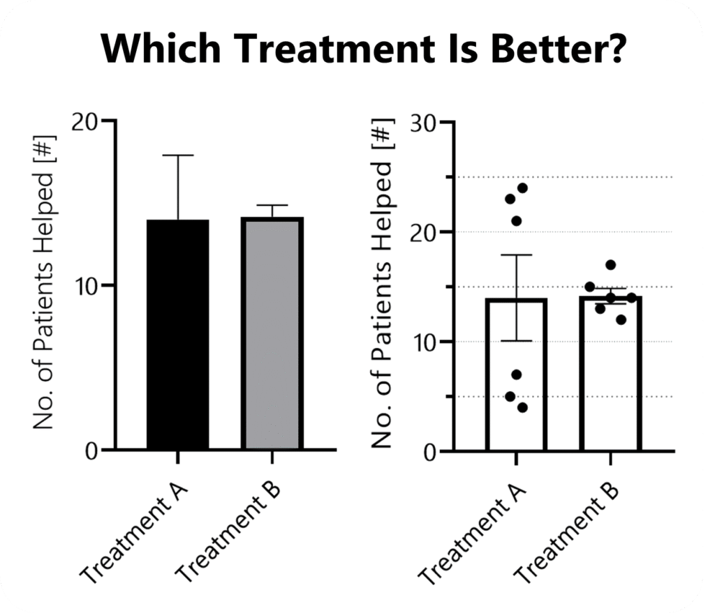 Imagine that six clinical trials, each with 30 participants, were conducted. If you only had three minutes to read the entire paper, it is unlikely you would draw the same conclusion when shown the graph on the left compared to the one on the right. Irrespective of the mean, the two populations only become evident in the right figure.