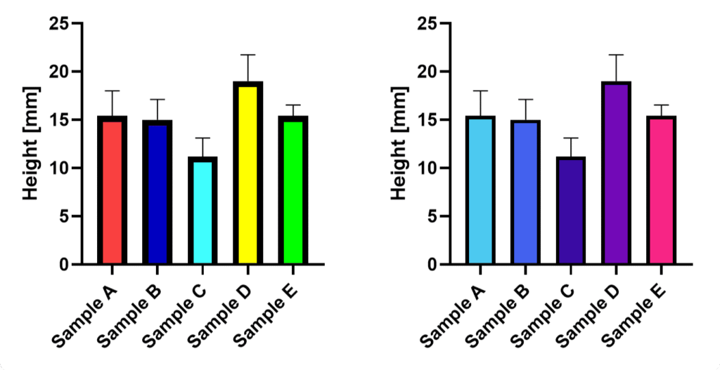 Could you reliably tell whether the dark blue bar is higher than the dark green one in the left figure? Nevertheless, the disharmonious choice of colors and the missing borders around the bars suggest that the graph on the left is less “professional.”