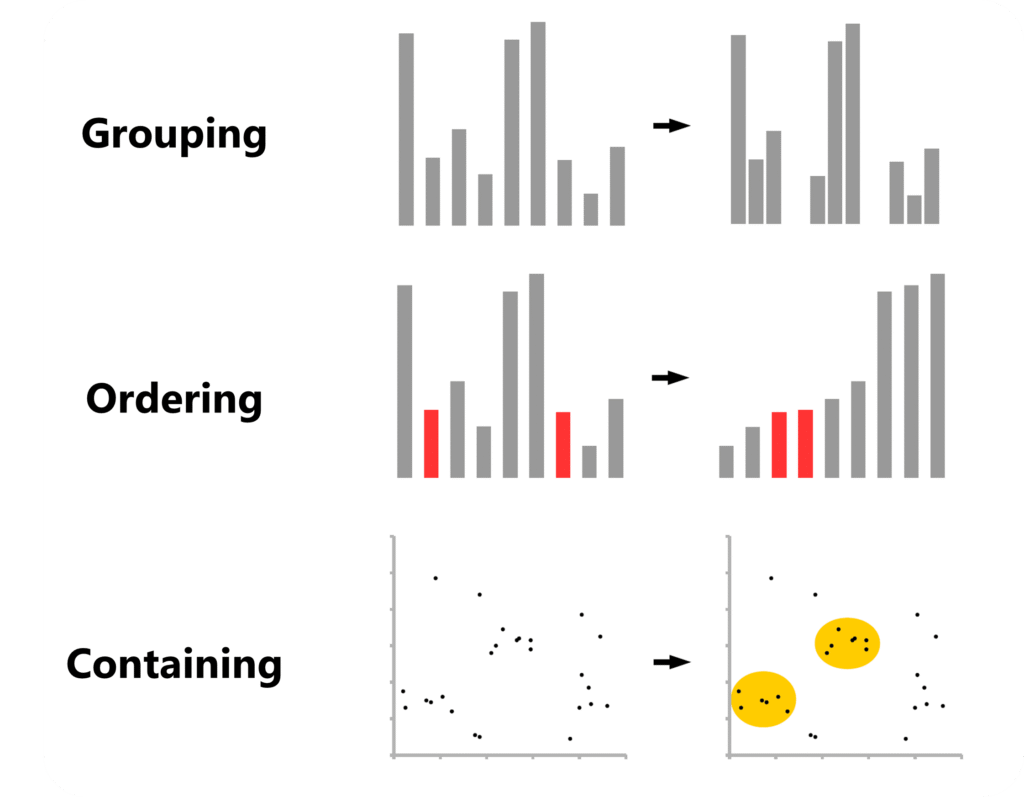 As outlined by Aiora Zabala in “Designing More Effective Scientific Figures” (VTP Graphic Design, Cancer Research UK), grouping, ordering, and containing can help readers analyze data at a more hierarchical level and therefore process it faster.