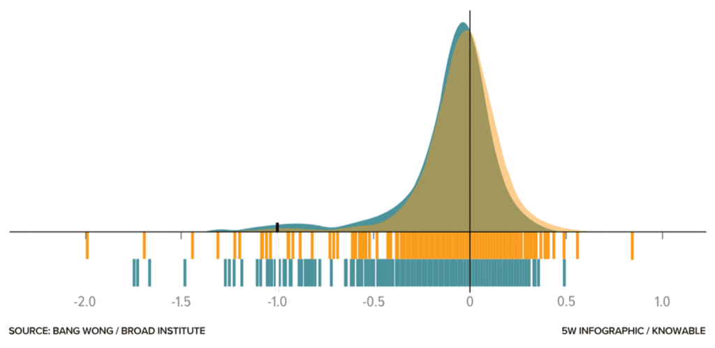 The graph above taken from this blog shows the dependency of cell lines on the gene FOXA1 – those to the left of the minus-1 reference line require the gene to survive. Note that for lower frequencies of cell lines, the barcode graph is advantageous, whereas for high densities, the bell curve excels.
